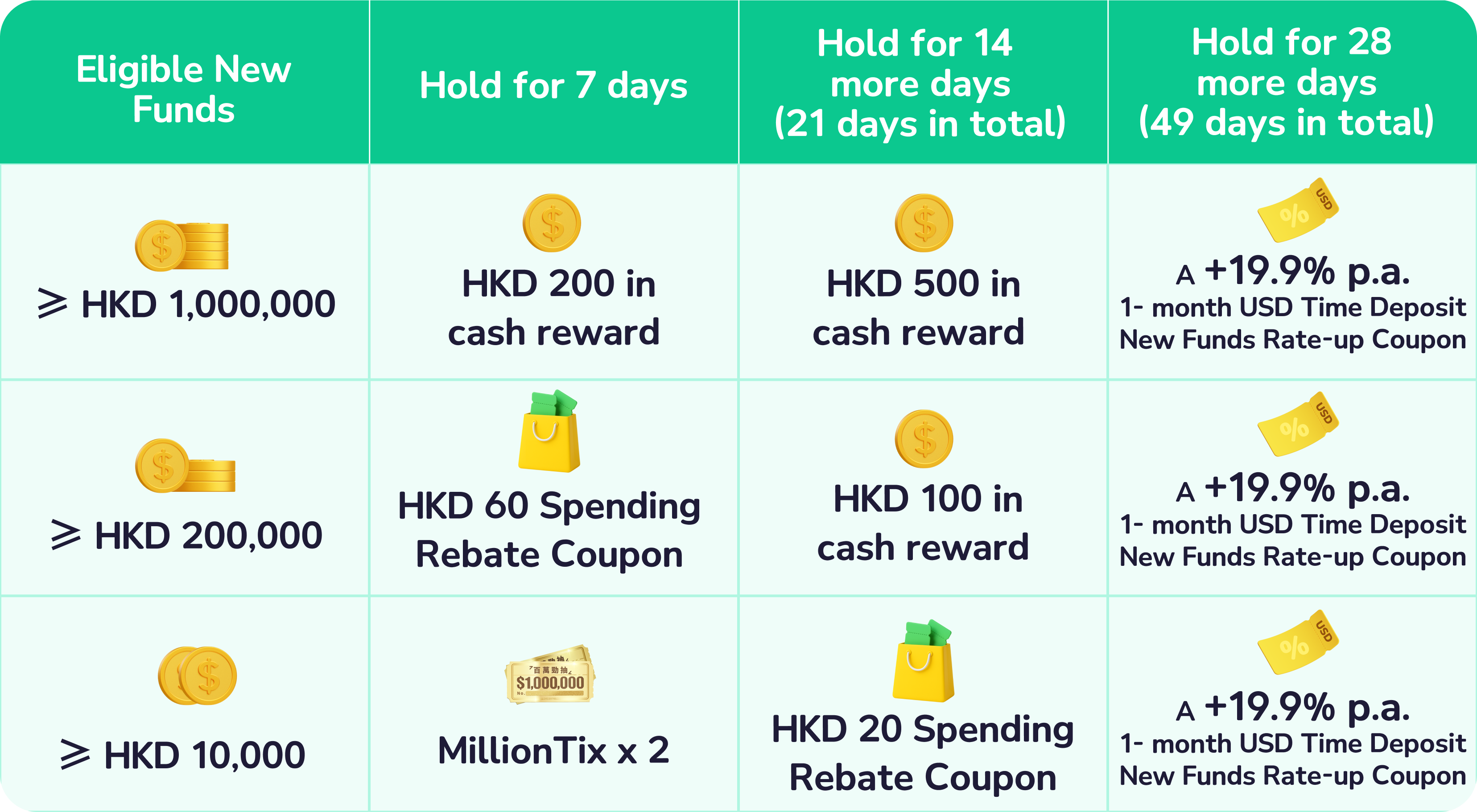 7. Participants whose end-of-day total balance reaches each specified target amount and maintain it for 49 days will separately receive a +19.9% p.a. 1-Month USD Time Deposit New Funds Rate-up Coupon, and enjoy a total time deposit rate of 20% p.a. when including the current basic rate. USD Time Deposit New Funds Rate-up Coupon for each specified target amount is valid for 7 days after receipt, but the applicable maximum amount of new funds varies. Please refer to the promotion page or promotion terms and conditions for details.
