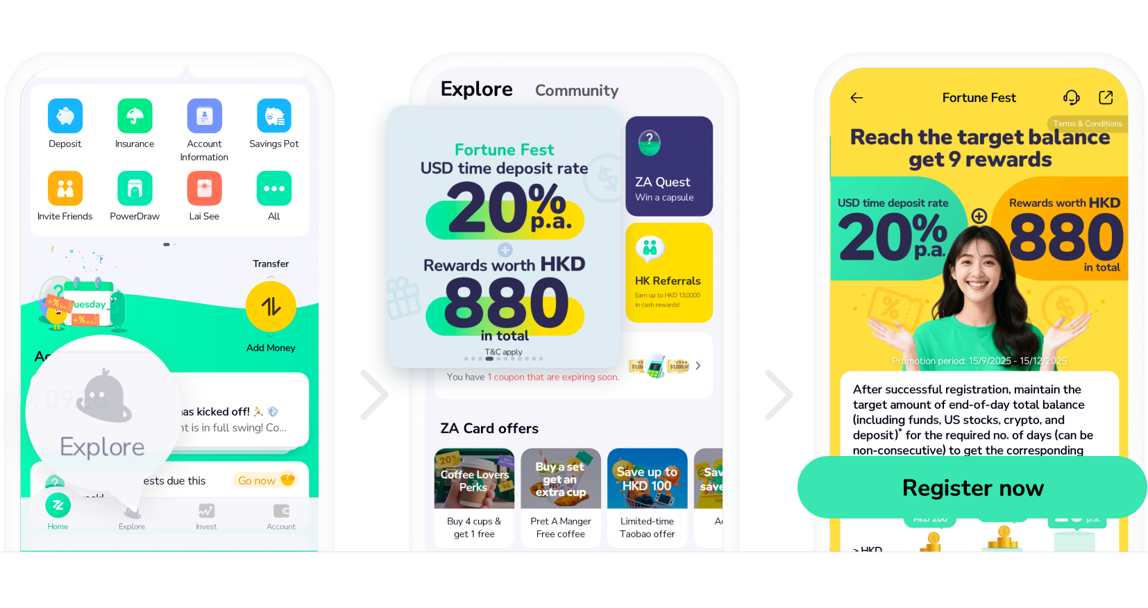 1. "Fortune Fest": The promotion period is from 15 Sep 2025 to 15 Dec 2025, both dates inclusive. Participants must register for the 'Fortune Fest' on the promotion page. After successful registration, Participants must deposit eligible new funds and maintain the target amount of end-of-day total balance displayed on the promotion page in ZA Bank for the specified number of days during the promotion period (can be non-consecutive) to get the corresponding rewards. The promotion is subject to its terms and conditions.