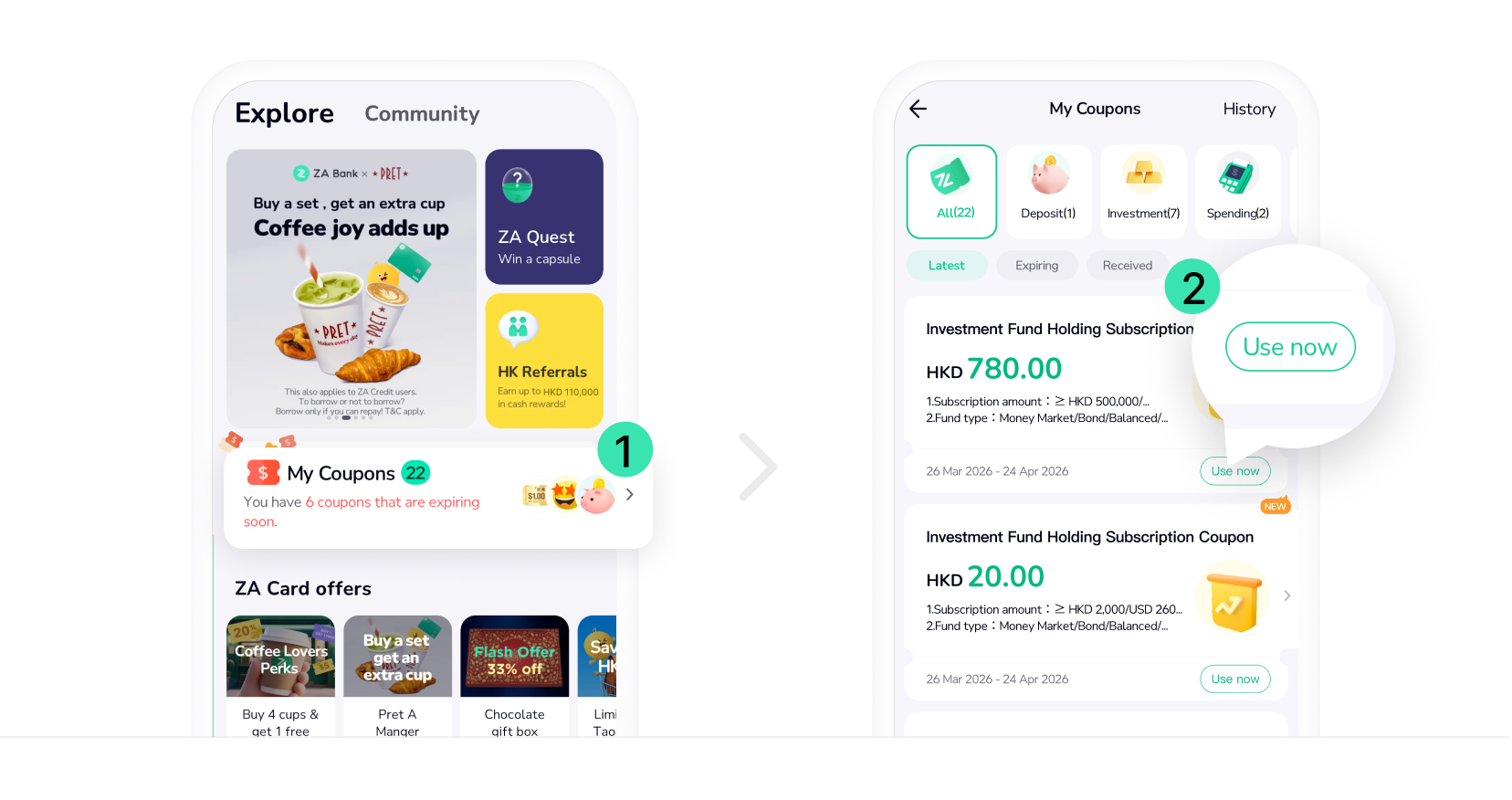 4. The Investment Fund Holding Subscription Coupon Packet includes HKD 780 and HKD 20 Investment Fund Holding Subscription Coupons. Coupons are valid within 30 days after receipt. For more details about the Investment Fund Holding Subscription Coupon, please refer to the T&C.