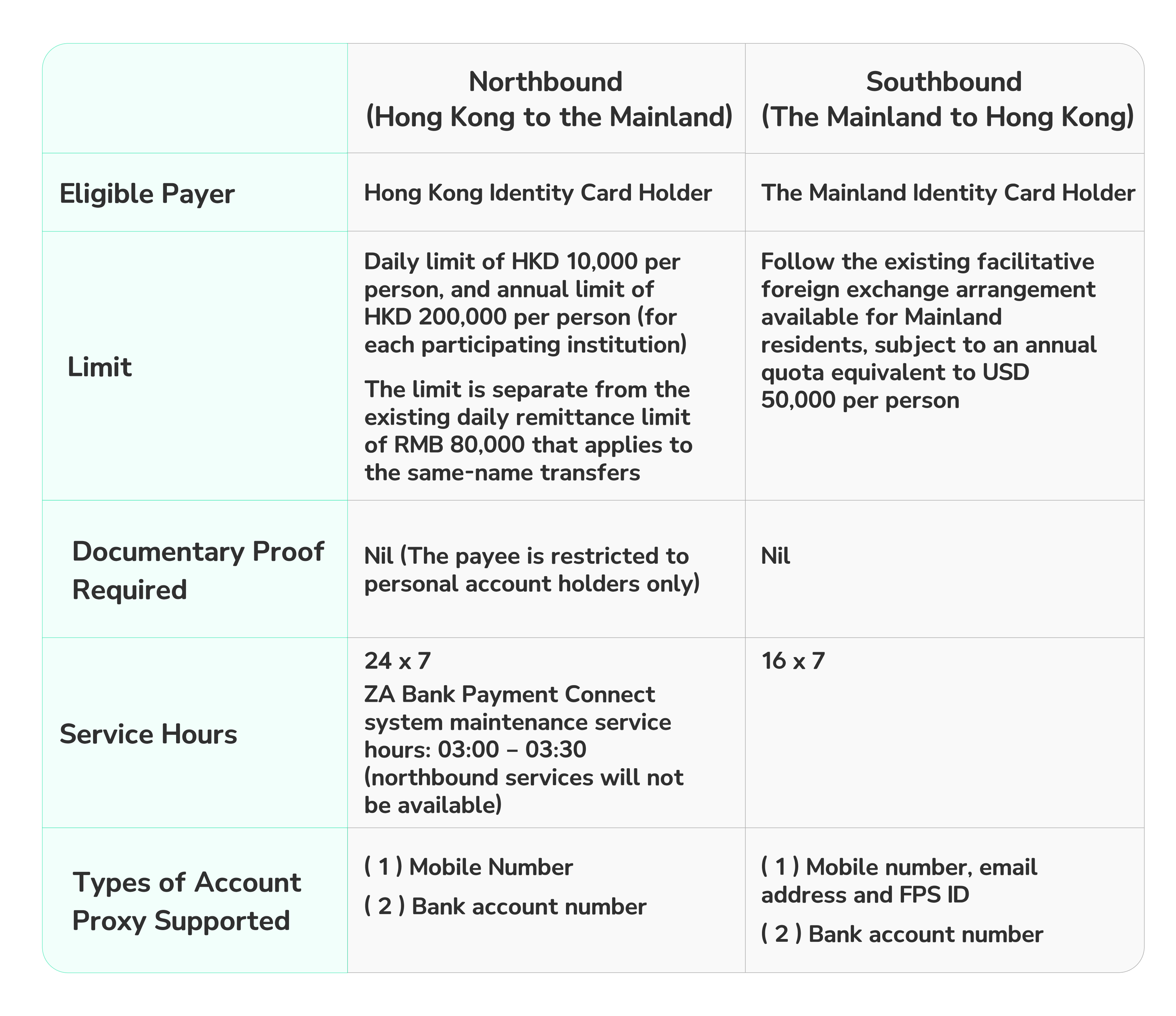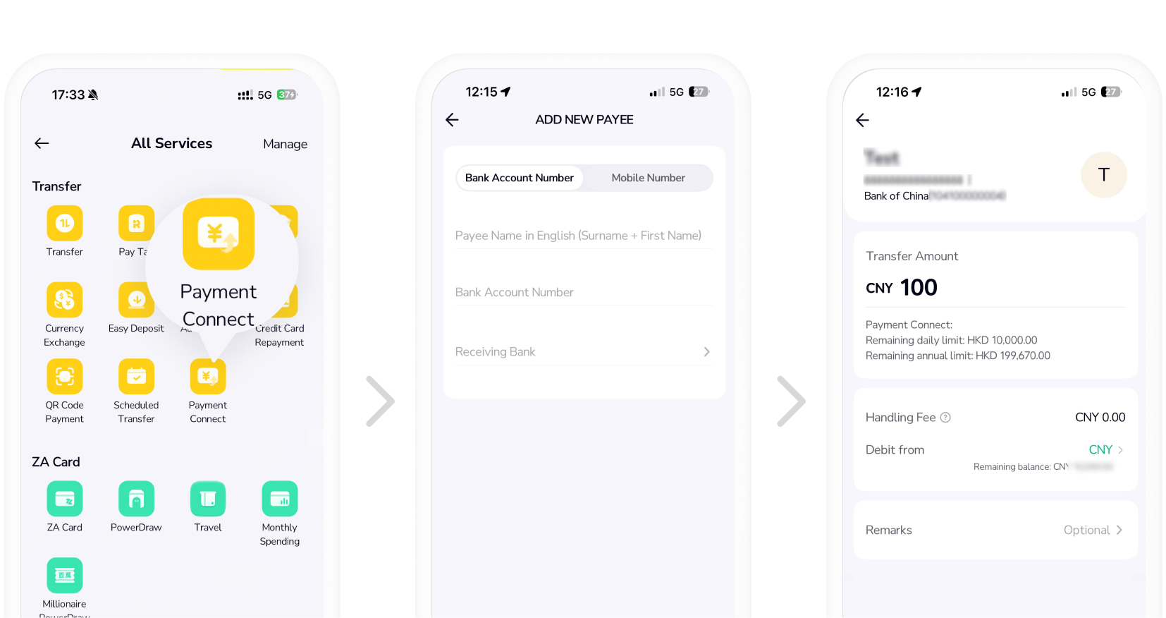 The Payment Connect has arrived at ZA Bank! Your ZA Bank account can receive CNY or HKD from designated banks in the Chinese Mainland instantly with 0 fees1! HK residents can similarly send CNY to designated bank accounts in the Chinese Mainland in real time.