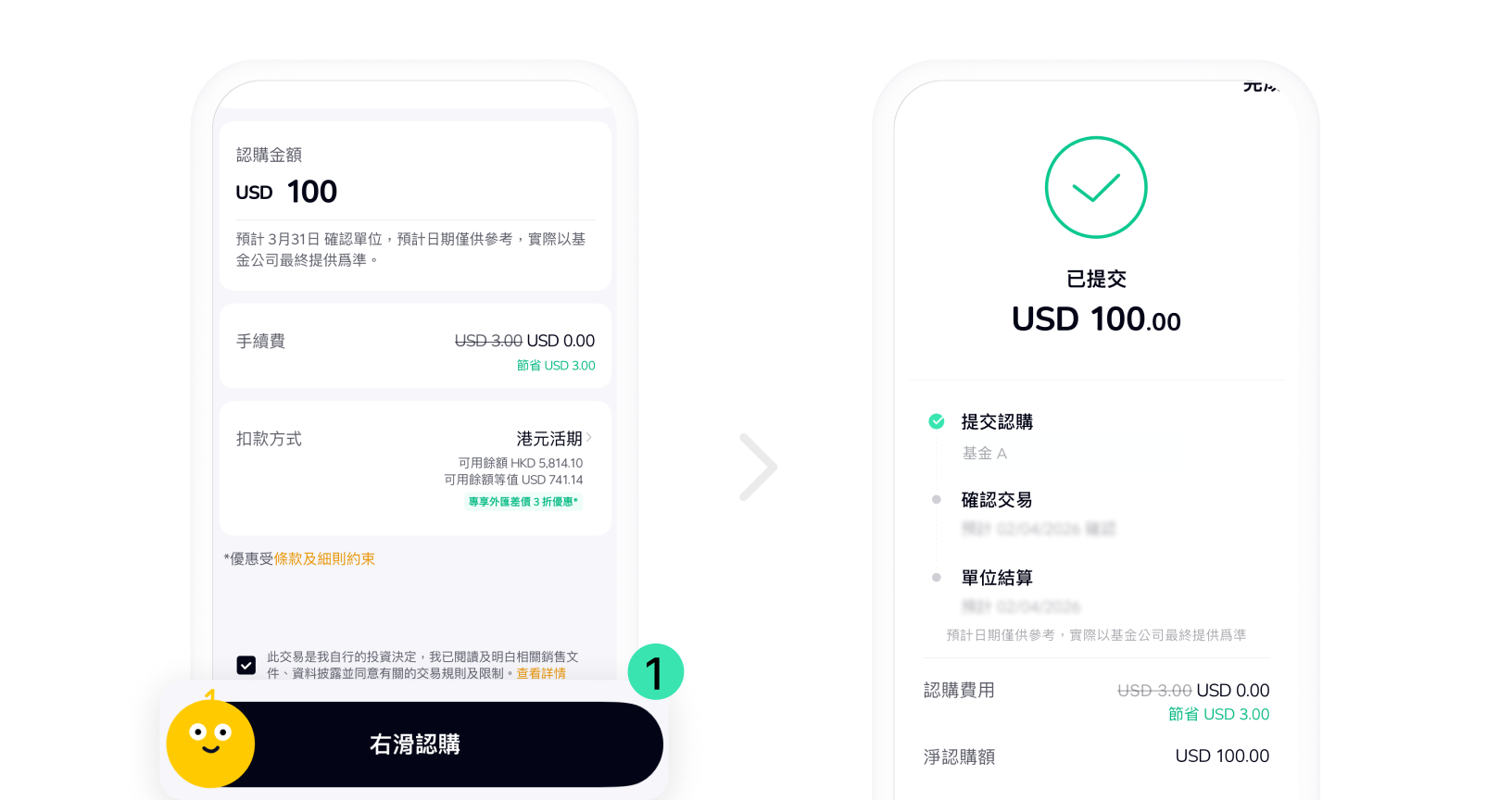 右滑認購,即可完成認購。全程毋須手動兌匯,流程更簡單,慳時又慳力。