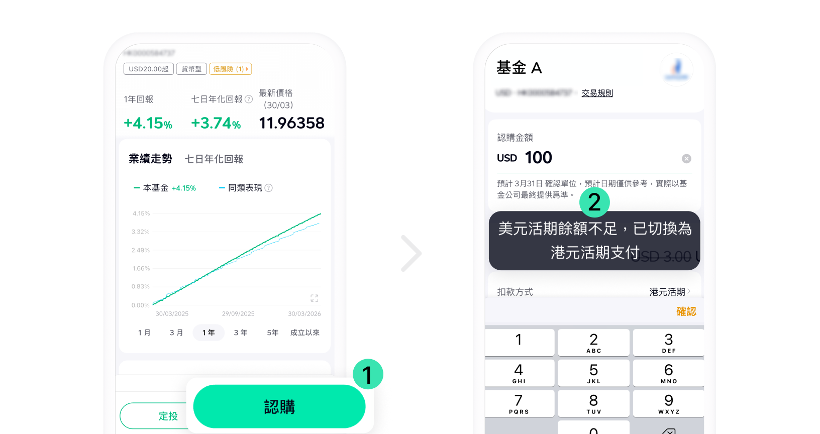 進入你所選擇的基金頁面,點擊「認購」並輸入金額。如認購金額高於你的美元活期賬戶餘額,系統會提示「已切換為港元活期支付」。