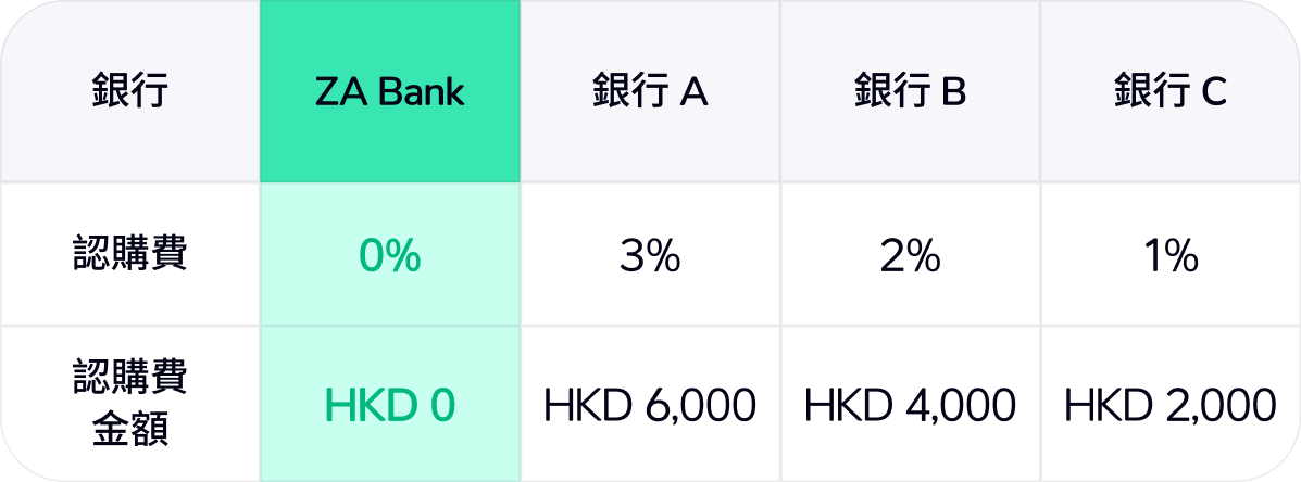 以 HKD 200,000 認購同一基金為例,透過 ZA Bank 認購,一筆交易可節省多達 HKD 6,000 ***。