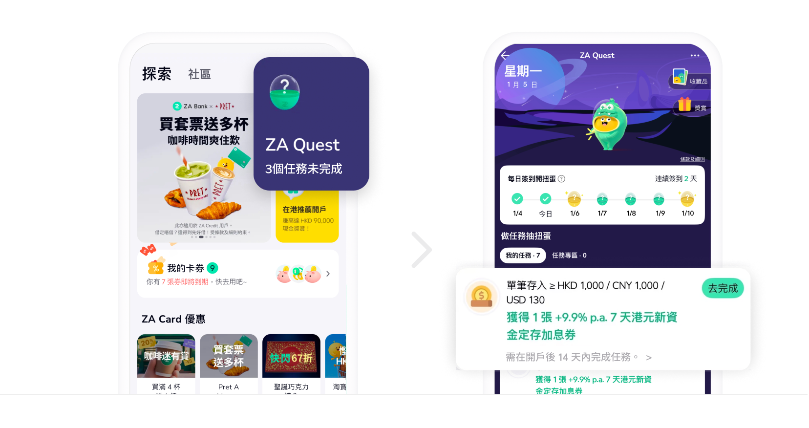 1. 前往 ZA Bank App >「探索」>「ZA Quest」 搵到新人入錢任務